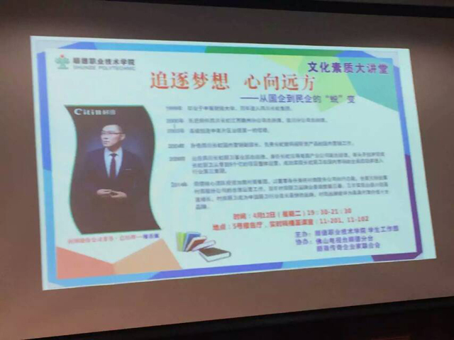 4月12日晚,应顺德职业技术学院和佛山电视台顺德分台、顺商传奇企业家联合会邀请,完美web版登录入口-完美(完美web版登录入口-完美(中国) )股份董事长罗兆波和董事·总经理廖香强、董事·燃气具公司总经理闫京东等领导一行来到顺职院,走进文化素质大讲堂,与众多在校学生、家长、老师和企业家,进行了一场高质量的精神交流与互动。