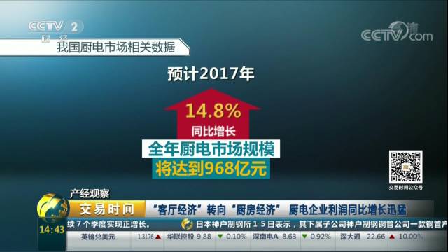 采访中提到,在家电行业中,相比白电、黑电企业,厨电企业利润是最高的,随着人们生活水平的提高,厨电在消费者眼中地位也越来越高,“厨房经济”逐步代替“客厅经济”,使家庭厨房逐渐成为家庭活动中心,价格也在不断的提升。中怡康数据显示,2014年~2016年厨电市场规模分别达到666、743、846亿元,年均增产率超过10%,以吸油烟机及燃气灶为代表的传统厨电品类,在2017上半年,依然保持两位数增长,分别为12.4%以及11.3%,高于整体家电市场增长速度,预计2017年全年厨电市场规模将达到978亿元,同比增长14.8%