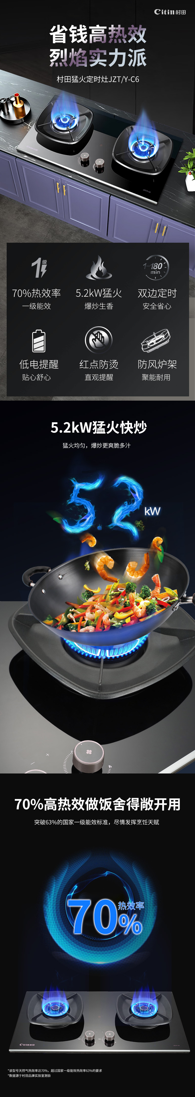 70%高效率+保洁炉头定时+低电量提醒零秒点火+宽频火火红点防烫提醒聚能方架+磨砂黑水盘